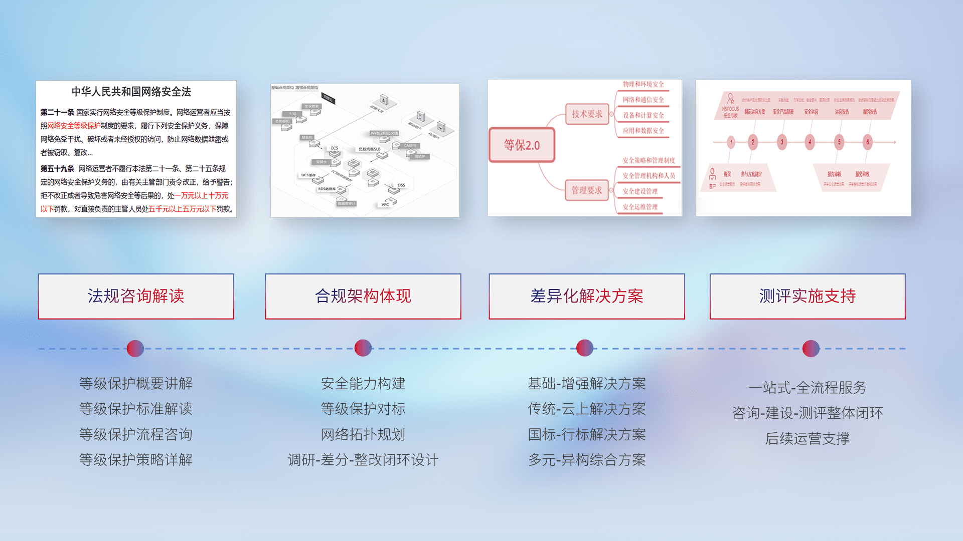 通过专业的法律咨询解读、、合规架构体现、、、差异化解决方案、、测试实施支持等服务,,,,为客户量身打造等保合规体系。。